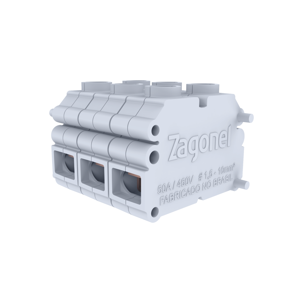 Para a sua maior segurança conector de cabos elétricos modular Zagonel. Possui sistema de fixação seguro, prático e rápido. Suportando fios com espessura de 1,5 até 10mm² e corrente máxima de 50A e tensão máxima de 450V.